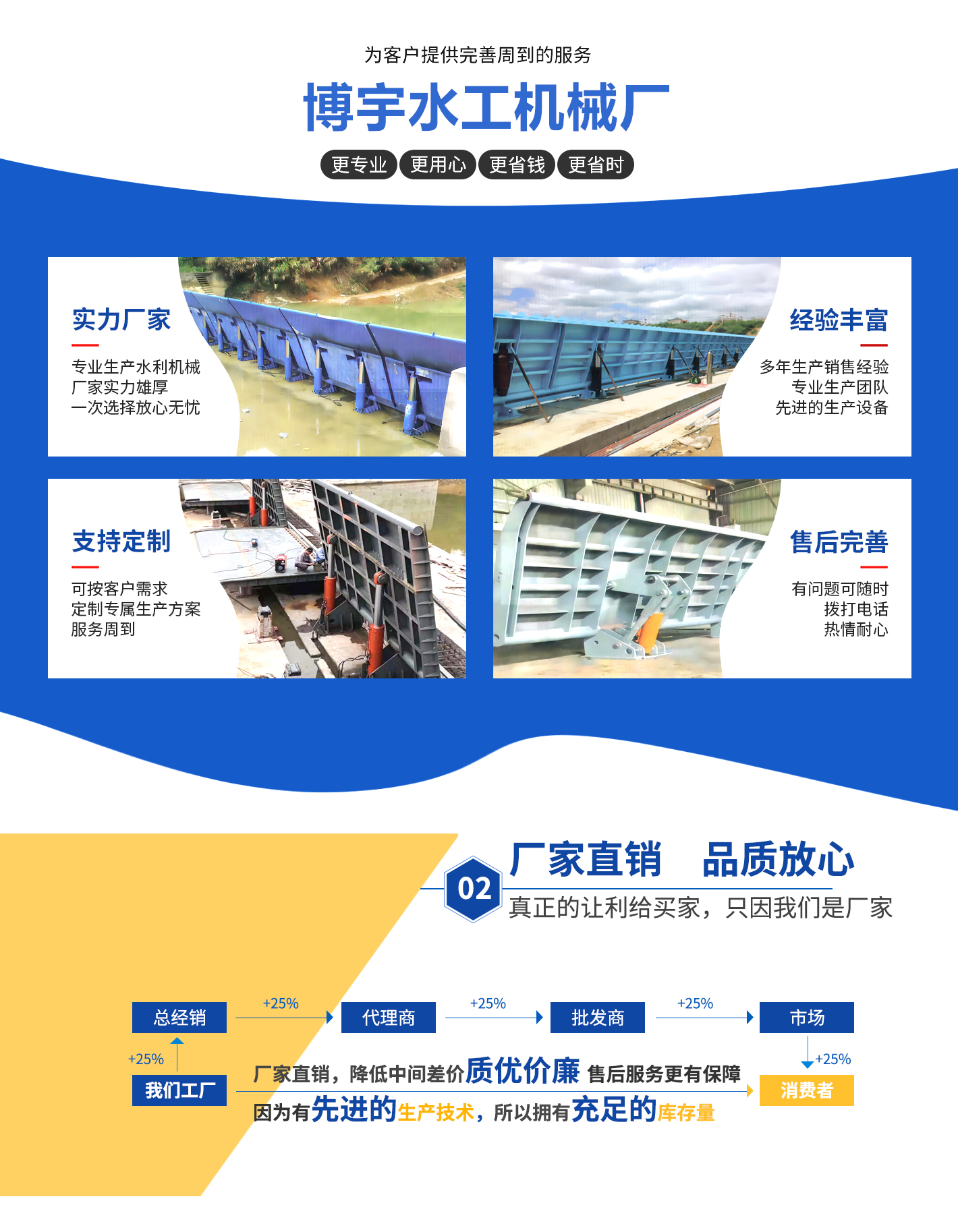 河北省衡水市博宇水工機(jī)械廠(chǎng)有著幾十年的發(fā)展歷史,是一家專(zhuān)業(yè)設(shè)計(jì)、制造、批量生產(chǎn)及指導(dǎo)安裝水工機(jī)械的綜合性企業(yè)。我公司具有完善的現(xiàn)代化管理模式、先進(jìn)的生產(chǎn)設(shè)備,同時(shí)我們還建立健全了產(chǎn)品質(zhì)量檢測(cè)及維護(hù)服務(wù)體系。不但品種齊全,而且售后服務(wù)良好。我們生產(chǎn)的閘門(mén)使用安全、結(jié)構(gòu)合理、性能良好、泄水量符合國(guó)家標(biāo)準(zhǔn),并且調(diào)試維護(hù)方便。主要品種: